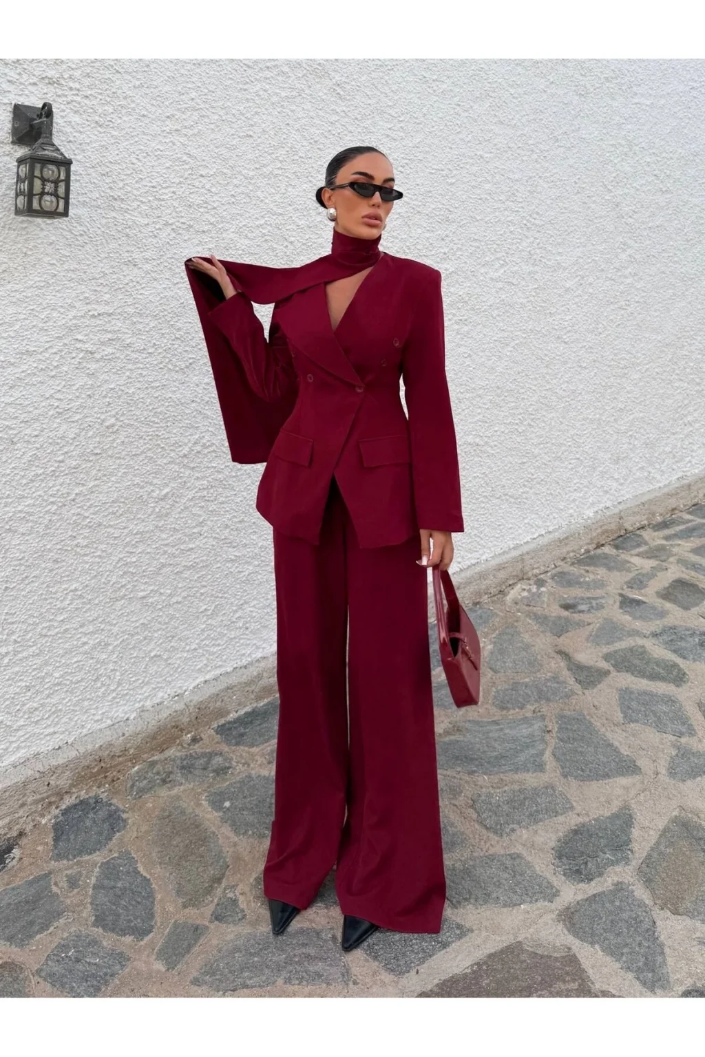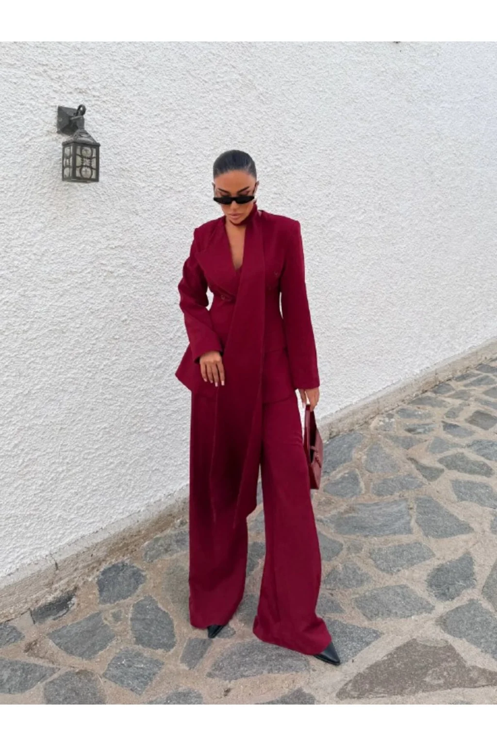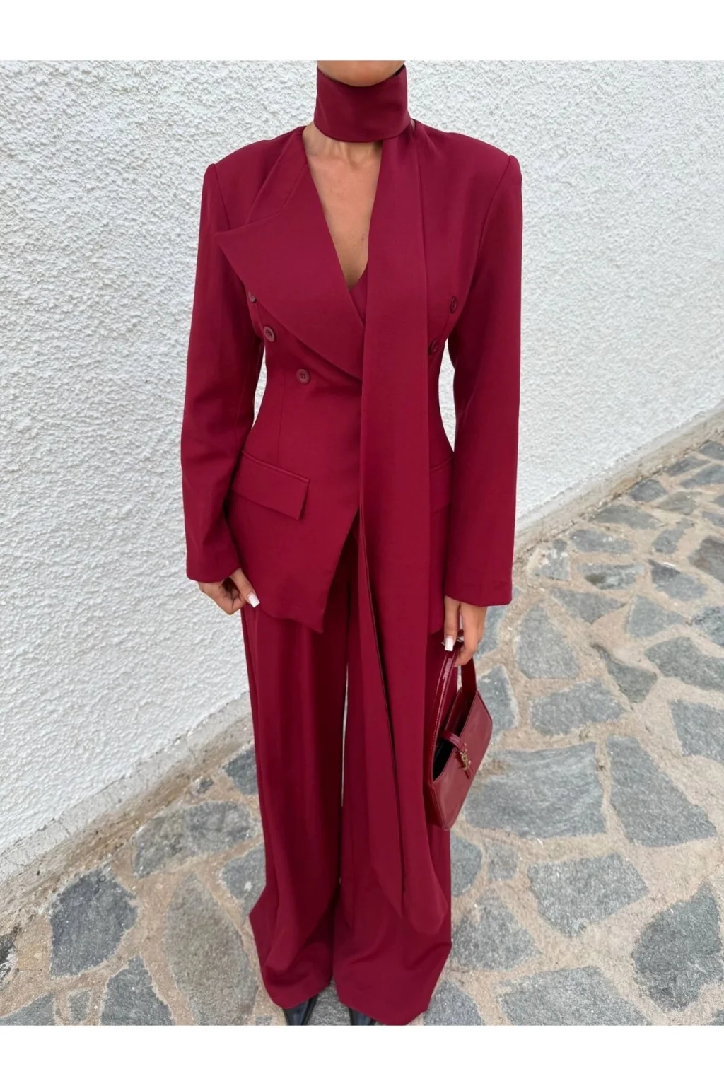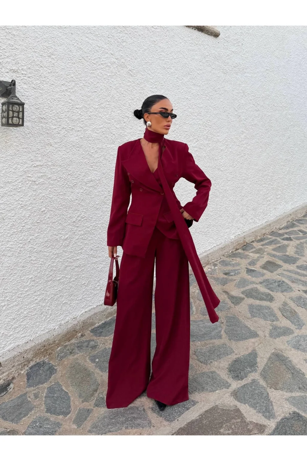 Ürün 3 parça Şal, Palazzo pantolon, Blazer ceketten oluşmaktadır.