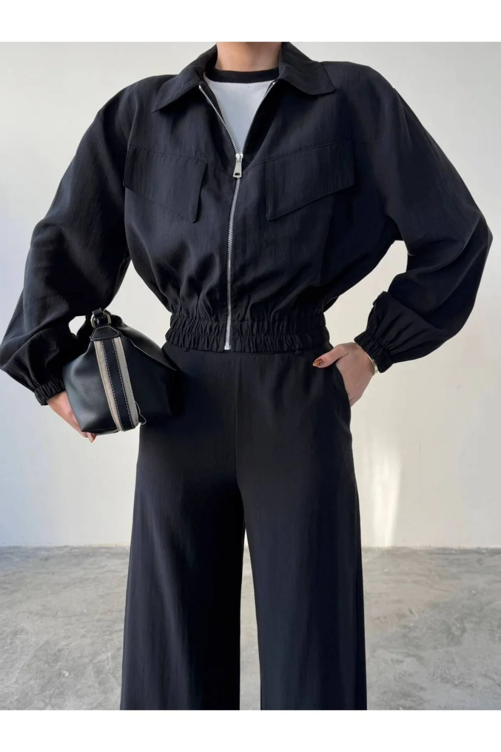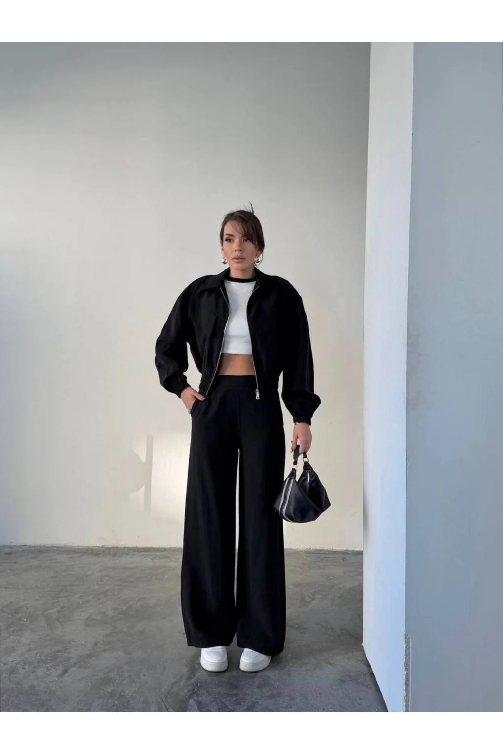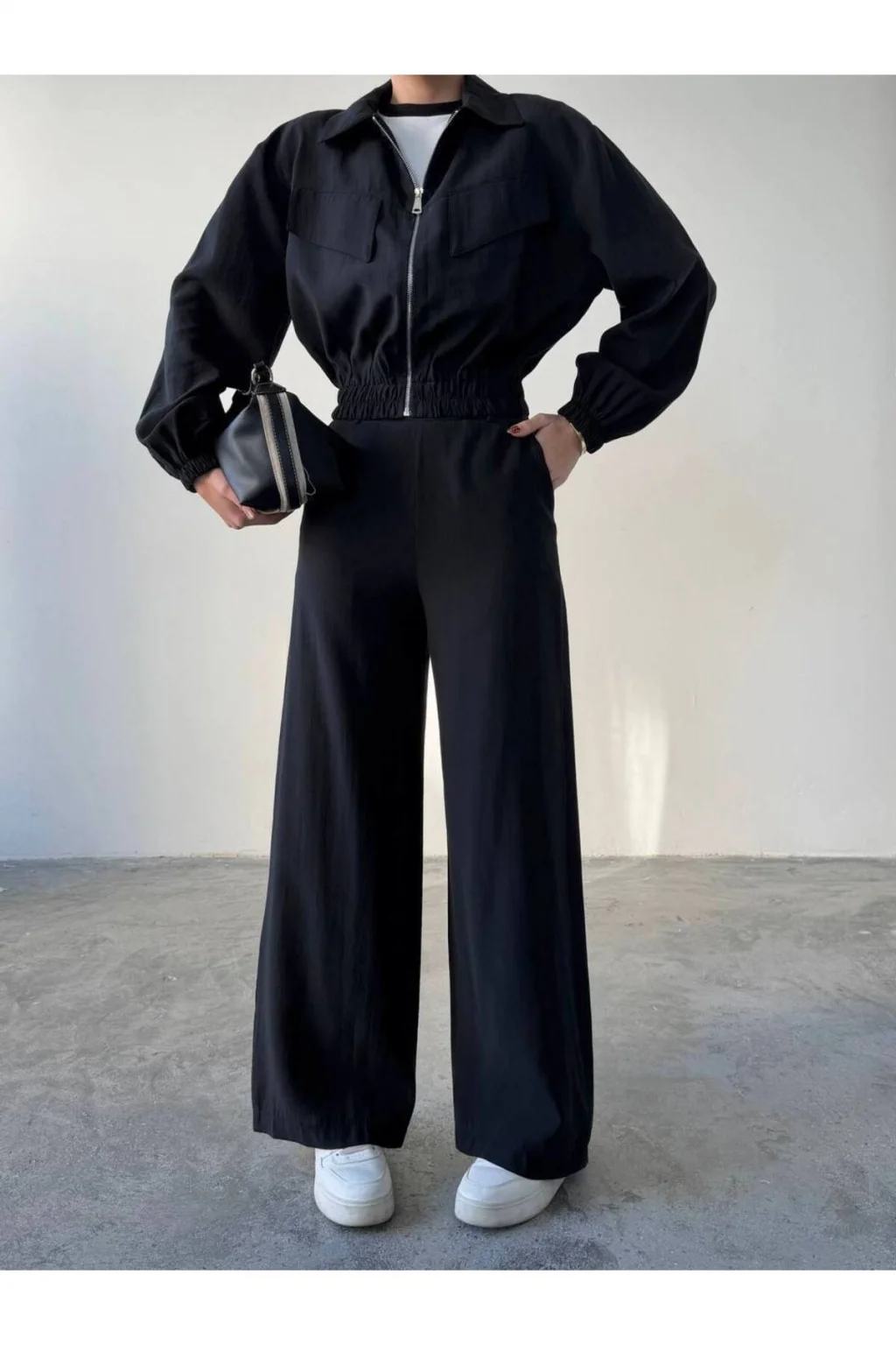Siyah Fermuarlı Ceket & Bol Paça Pantolon Kadın Takım